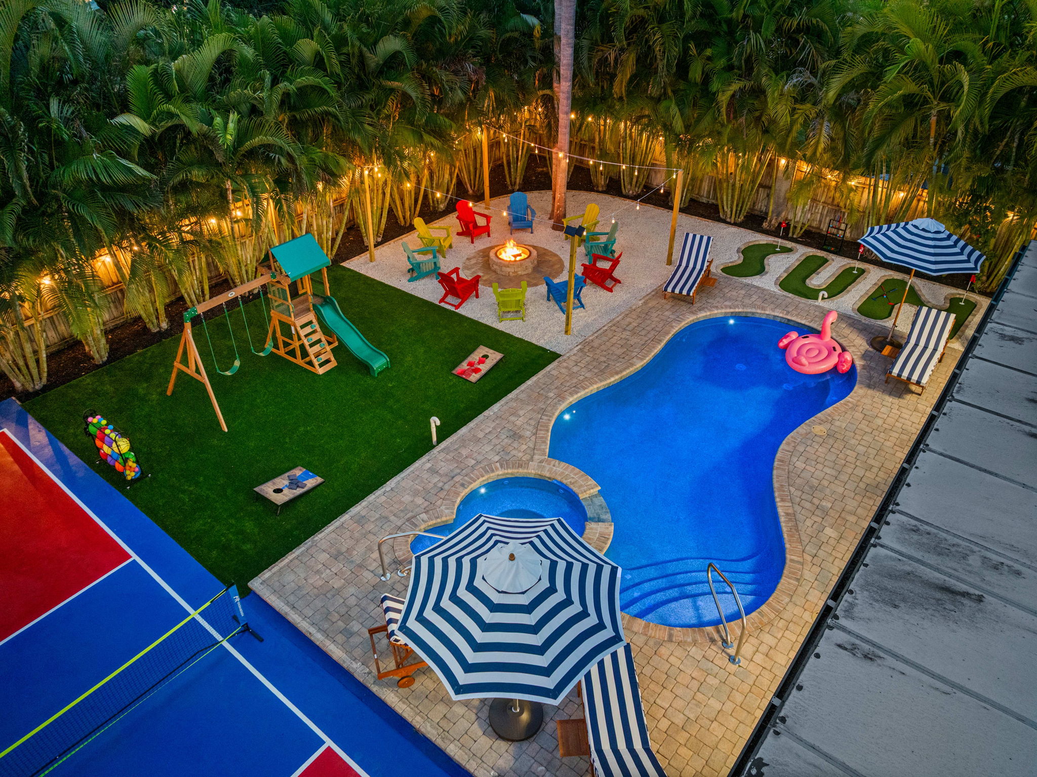 ☀ Huge backyard with heated pool, mini golf, pickleball and basketball court, bowling, fire pit, playground and barbecue grill